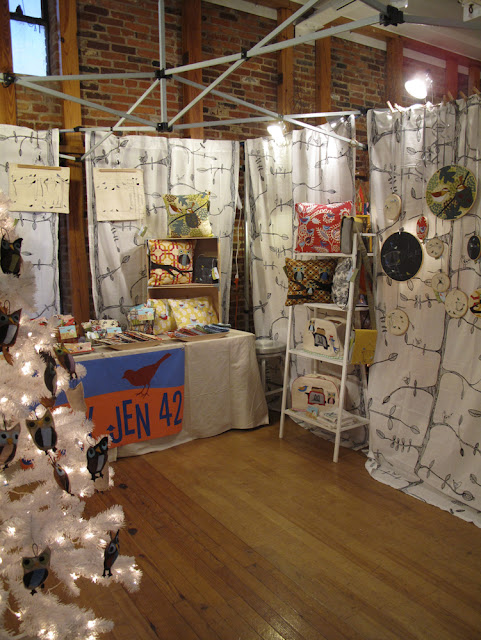 Bazzart, is held every Friday night and Saturday of Thanksgiving weekend at the American Visionary Museum and I have been so gracious to be accepted for the past four years! I get to create my own 10 foot square shop and this year IKEA really came though with beautiful birdy bird curtains that look like they came right out my own pen! in fact many customers commented on my wall curtains and thought I had to have made them. The amount of complements and purchases let me take the day off today and clean and organize my new house ( future post to come on that one, I promise!)/ Here are some pics f my shop! I really do think I could do this for a living!